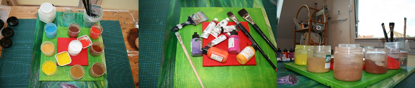 Ich bevorzuge selbst hergestellte Acrylfarben, indem ich feinste Künstlerpigmente mit Acrylbindemittel anrühre.